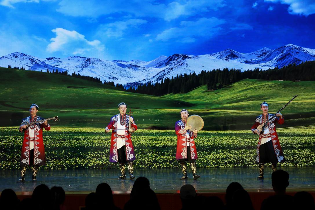 在器乐合奏《山之水》的舞台上,一场令人惊喜的互动环节将现场气氛推向高点!维吾尔族乐器共同奏响清新自然、婉转悠扬的旋律,勾勒出祖国大好河山的秀美壮阔。