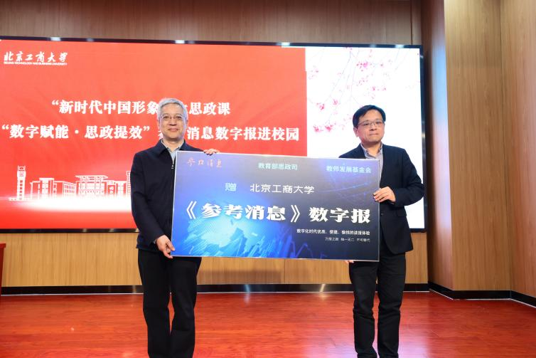 《参考消息》报党委常委、副总编辑何晏在致辞中表示,“数字赋能·思政提效”公益项目自2023年启动以来,已覆盖全国31个省区市2500余所高校,每年走进高校举办数十场主题讲座,累计捐赠数字报超50万份。《参考消息》将依托“新时代中国形象”大思政课为平台,持续以数字化产品赋能高校思政工作,搭建起青年学子连接世界的新通道,助力北工商学子拓宽国际视野、厚植家国情怀,在读懂世界中坚定爱国之情、强国之志。