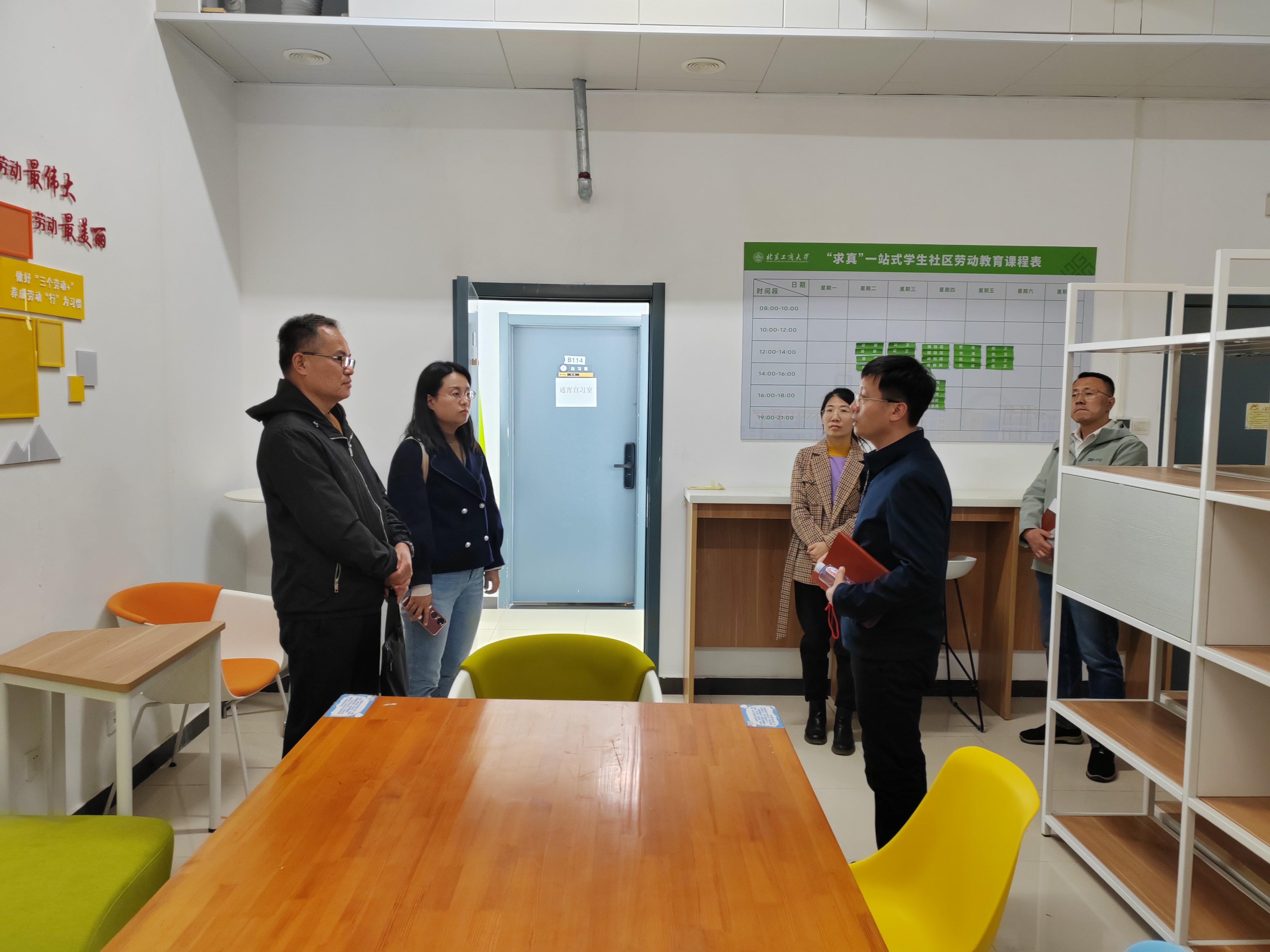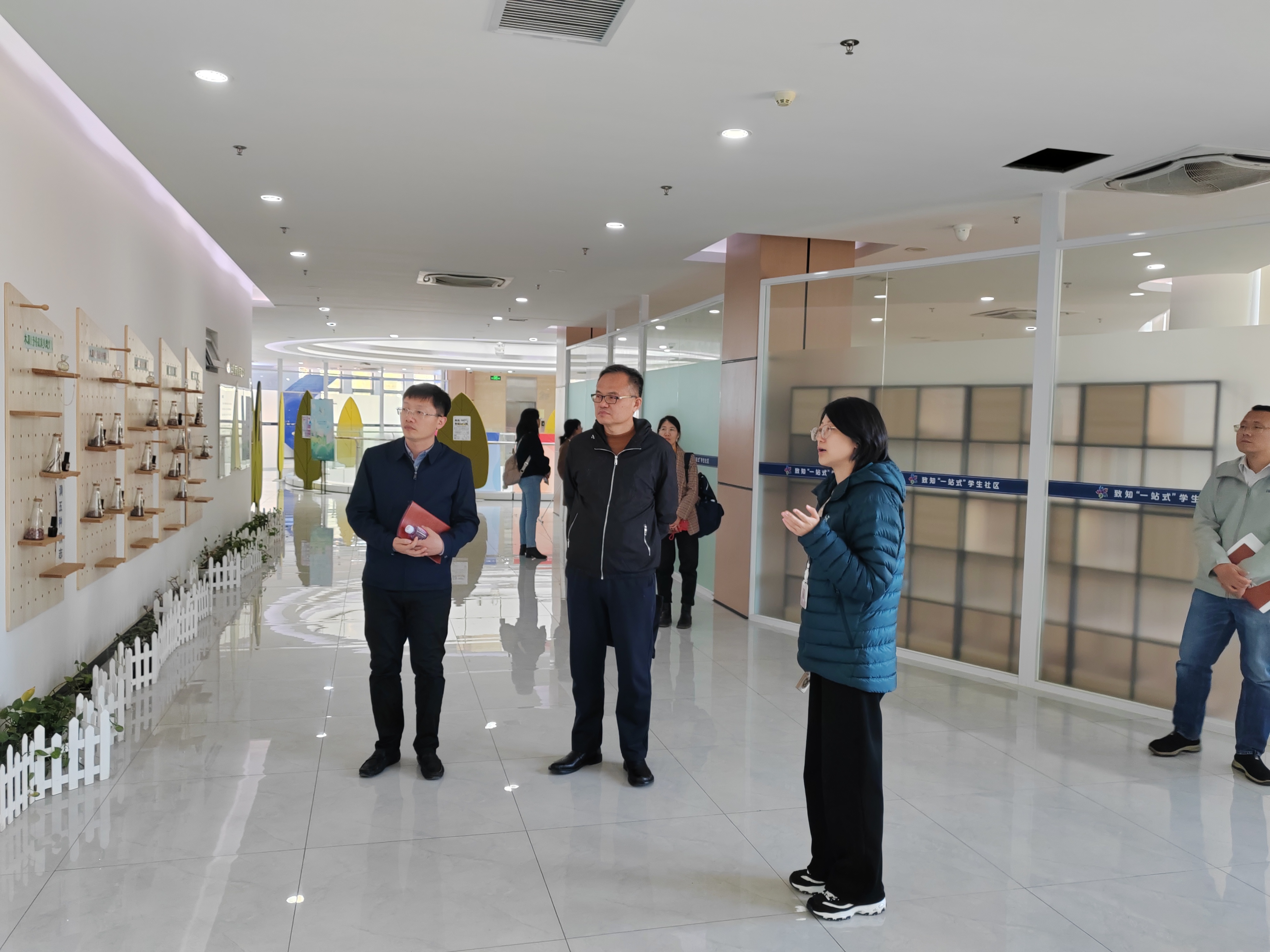 随后,双方围绕思想政治教育、AI辅导员建设、学生资助、心理健康和后勤服务保障等方面进行了交流与讨论。会后,实地参观了我校致知“一站式”学生社区、心理素质教育中心和学生餐厅。