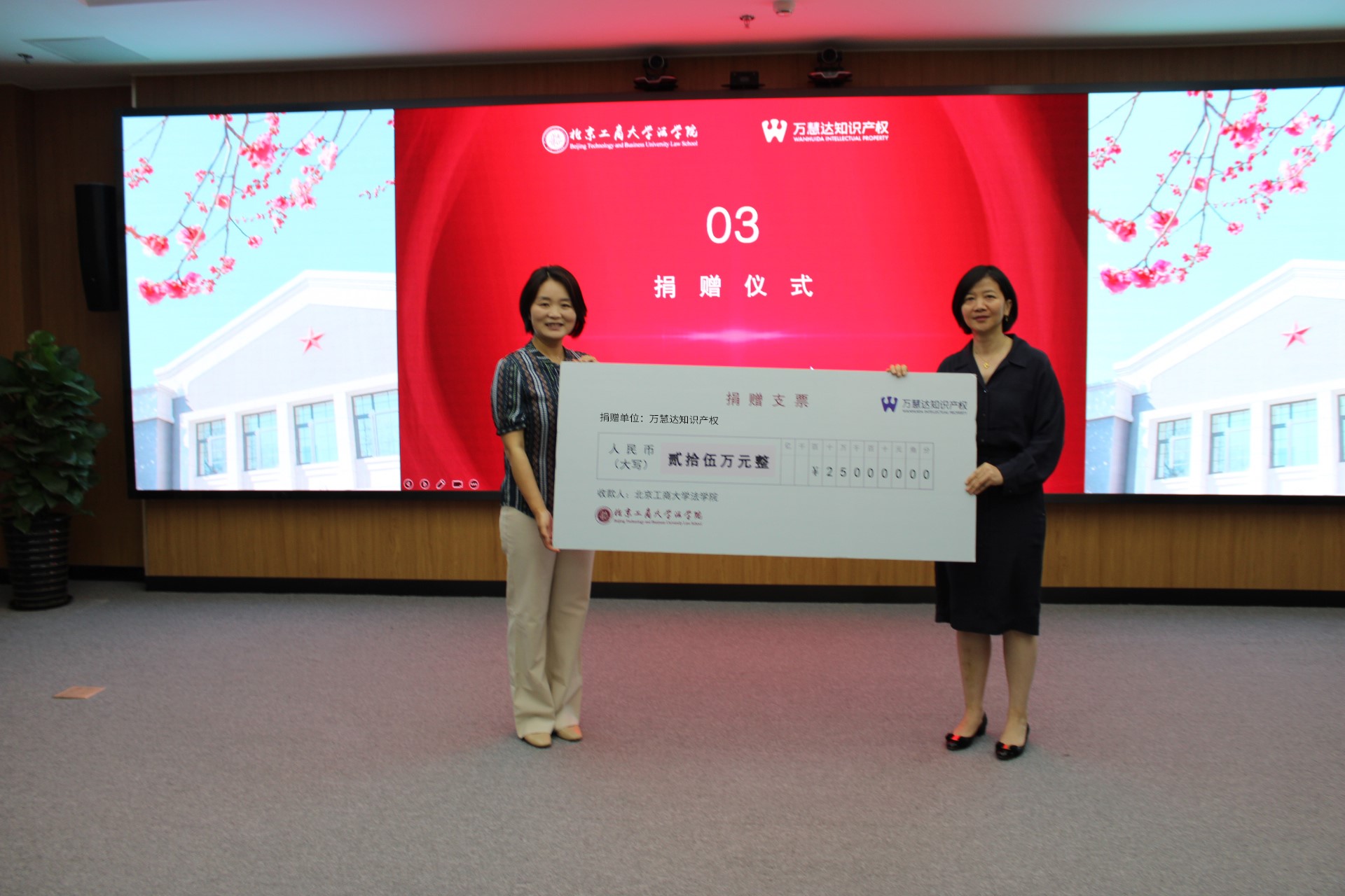 在捐赠仪式环节,万慧达向北京工商大学法学院捐赠人民币25万元,用于发展学院法学学科和培养知识产权领域法学创新人才。