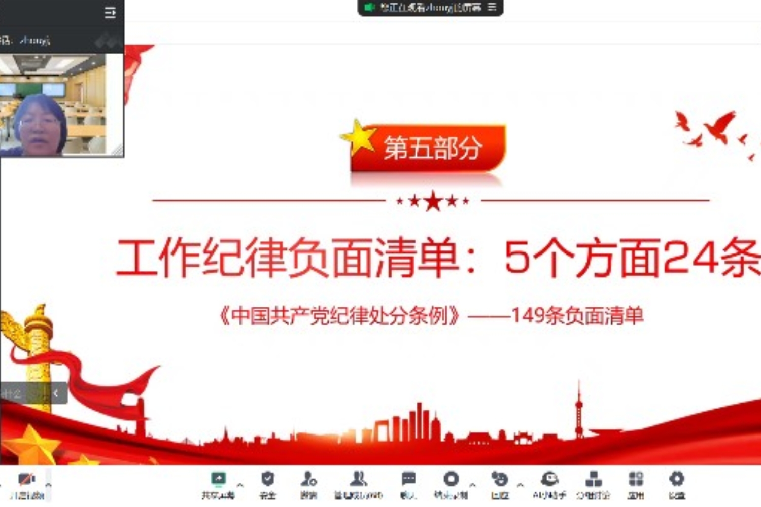 周艳杰从纪律处分的历史沿革、知悉负面清单和以廉护航开启新征程三个部分展开。她讲到,中国共产党始终重视纪律建设,在建党之初,党的一大通过的第一个纲领,就包含了政治纪律、组织纪律、保密纪律的相关内容,党的十八大以来,中国特色社会主义进入新时代,纪律教育的力度持续加大,纪律教育的水平不断提高,纪律教育的效果更加显著。紧接着,她从分则的政治纪律、组织纪律、廉洁纪律、群众纪律、工作纪律、生活纪律六方面解读了《中国共产党纪律处分条例》的负面清单,教育党员对违纪行为说不,并以95后贪官张雨杰贪污案为例做警示教育,提醒学生坚守为民服务初心、坚定理想信念、严格遵规守纪,做清正廉洁、光明磊落的共产党员。她引用《爱莲说》启发学生要为人清廉,永葆政治本色,算好人生政治账、经济账、名誉账、家庭账、亲情账、自由账和健康账,做到慎权、慎欲、慎微、慎独和慎友,树立正确的权力观、地位观、利益观,在未来的学习工作生活中崇廉尚洁、严以律己,守正初心,行稳致远。