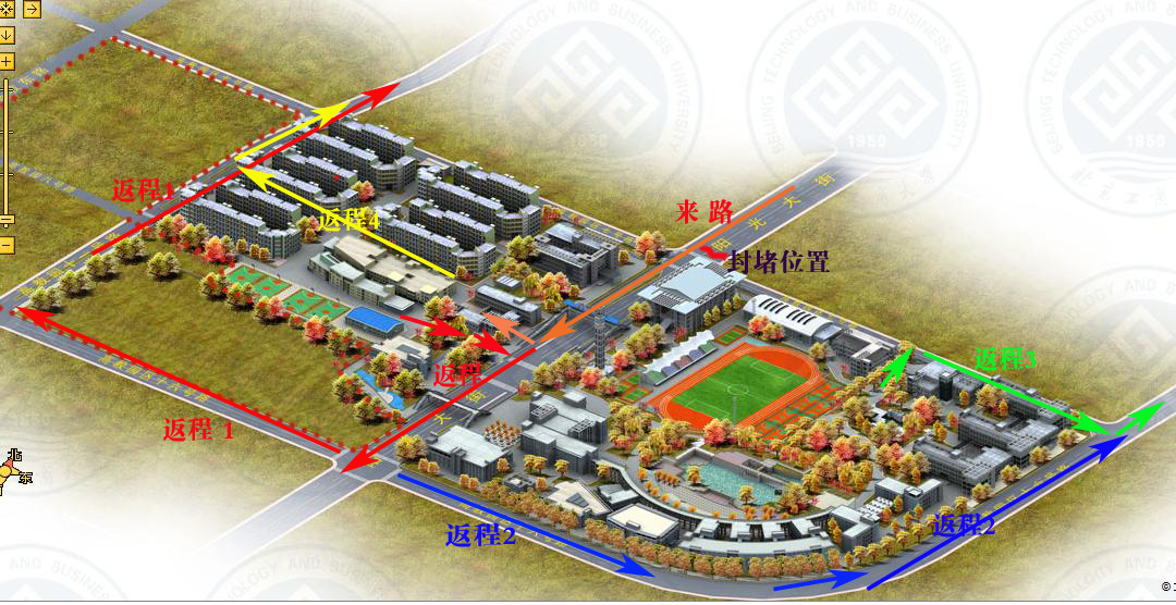 3、教学区北门车辆出来后直接向东进入16号路;车辆从生活区西门出来进入11号路后直行向北。