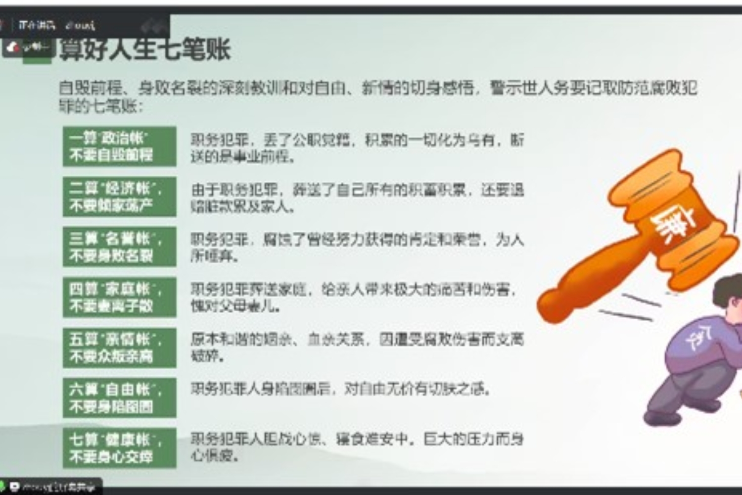 周艳杰从纪律处分的历史沿革、知悉负面清单和以廉护航开启新征程三个部分展开。她讲到,中国共产党始终重视纪律建设,在建党之初,党的一大通过的第一个纲领,就包含了政治纪律、组织纪律、保密纪律的相关内容,党的十八大以来,中国特色社会主义进入新时代,纪律教育的力度持续加大,纪律教育的水平不断提高,纪律教育的效果更加显著。紧接着,她从分则的政治纪律、组织纪律、廉洁纪律、群众纪律、工作纪律、生活纪律六方面解读了《中国共产党纪律处分条例》的负面清单,教育党员对违纪行为说不,并以95后贪官张雨杰贪污案为例做警示教育,提醒学生坚守为民服务初心、坚定理想信念、严格遵规守纪,做清正廉洁、光明磊落的共产党员。她引用《爱莲说》启发学生要为人清廉,永葆政治本色,算好人生政治账、经济账、名誉账、家庭账、亲情账、自由账和健康账,做到慎权、慎欲、慎微、慎独和慎友,树立正确的权力观、地位观、利益观,在未来的学习工作生活中崇廉尚洁、严以律己,守正初心,行稳致远。
