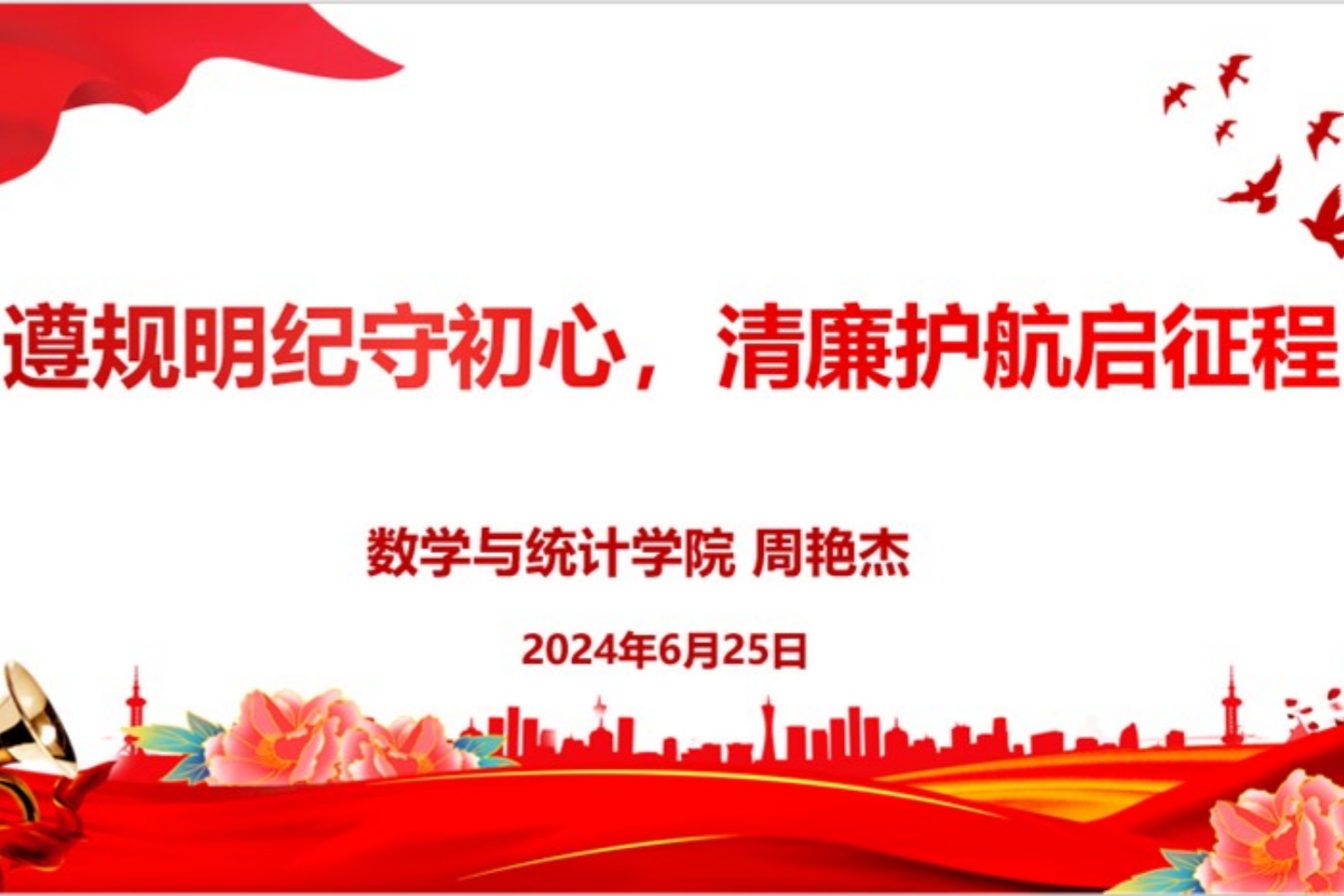 为推动党纪学习教育走深走实,引导毕业生党员坚定理想信念,牢记党员身份,勇于担当作为,6月25日下午,数学与统计学院党委书记周艳杰以“遵规明纪守初心,清廉护航启征程”为主题讲党课并作廉洁教育,2024届毕业生党员聆听了党课。