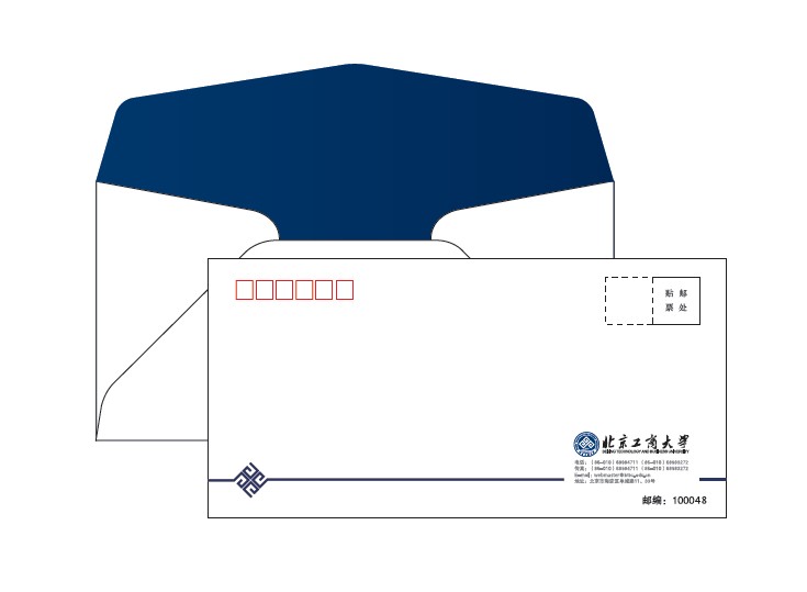 信封是传达北京工商大学学校形象的媒介之一,本页列举DL号信封的使用规范,在实际应用中严禁对标识与名称的组合方式、标准色以及设计版式做任何改动,邮政编码格的位置及颜色标准按国家有关部门管理规定执行。