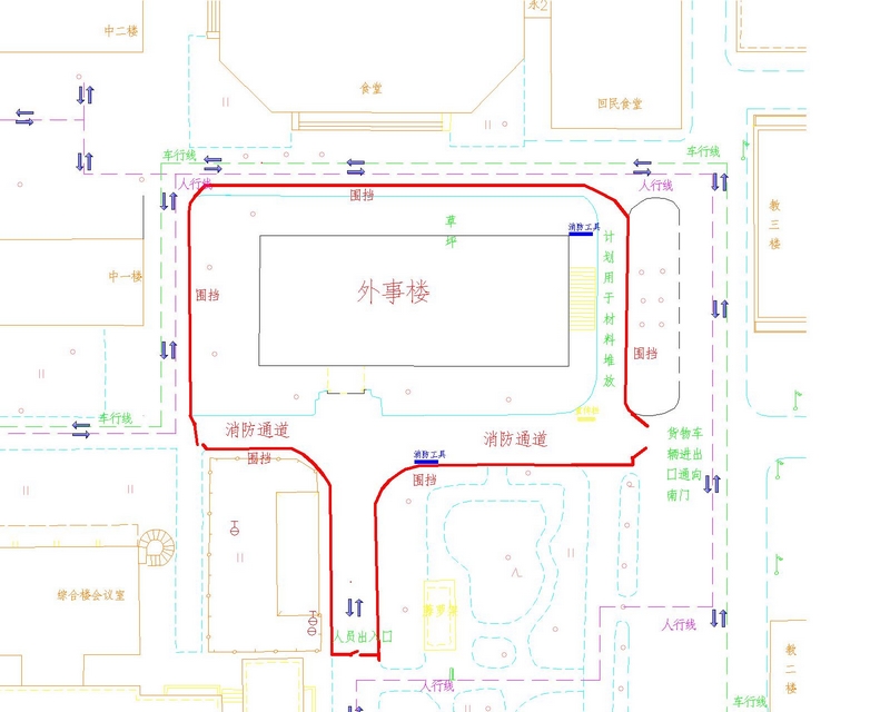施工四至:东至外事楼东5米(雪松墙);西至外事楼西5米;南至花园中心(东西向道路封闭);北至外事楼北5米。