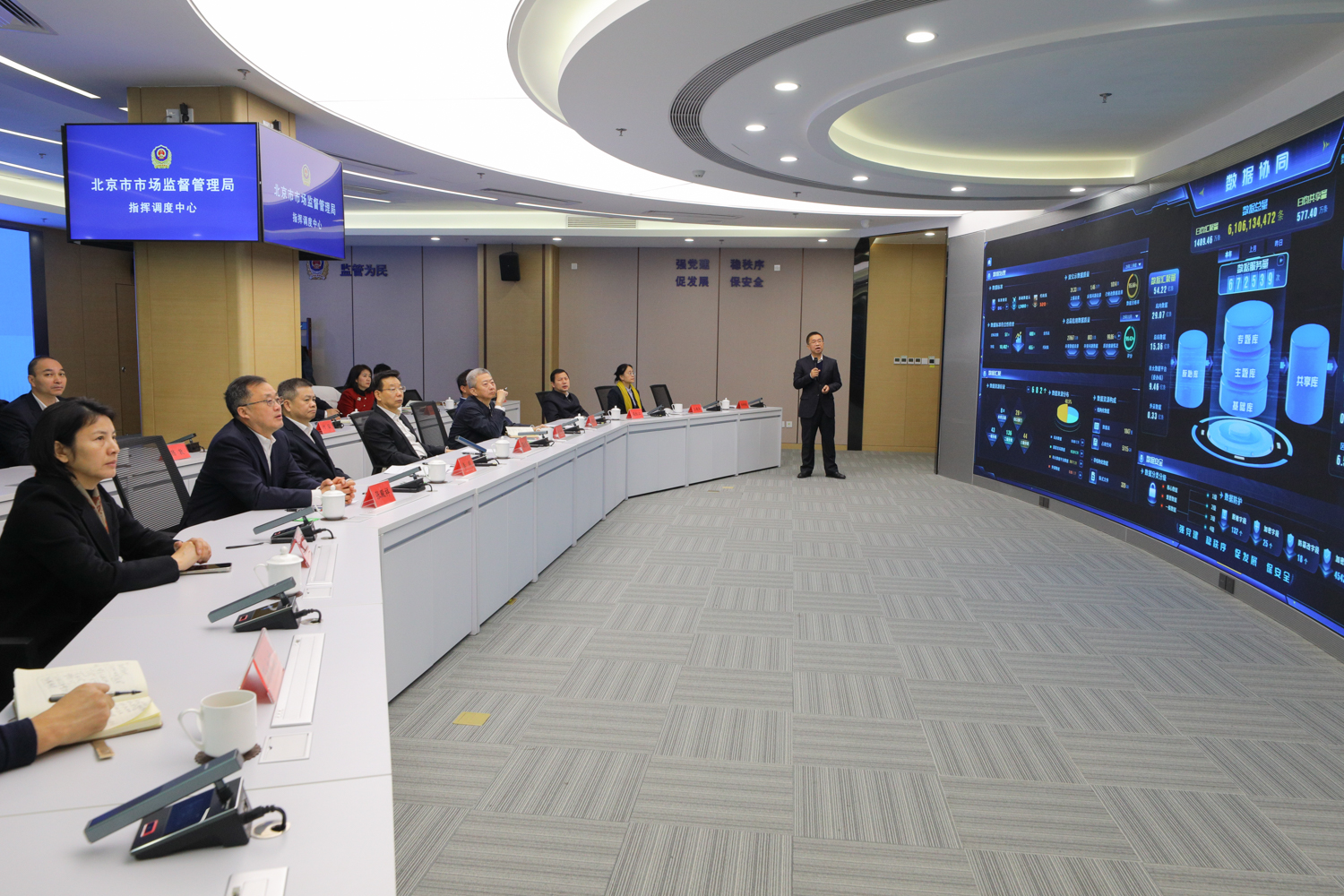 签约仪式前,与会人员参观了市市场监管局调度指挥中心,深入了解智慧监管平台运行与数字化创新应用成果。大家通过市场监管数据中台,重点了解全市市场监管数字化改革、数据治理能力提升、助力经营主体高质量发展、一体化综合监管改革、智慧监管基础能力建设等工作推进情况。