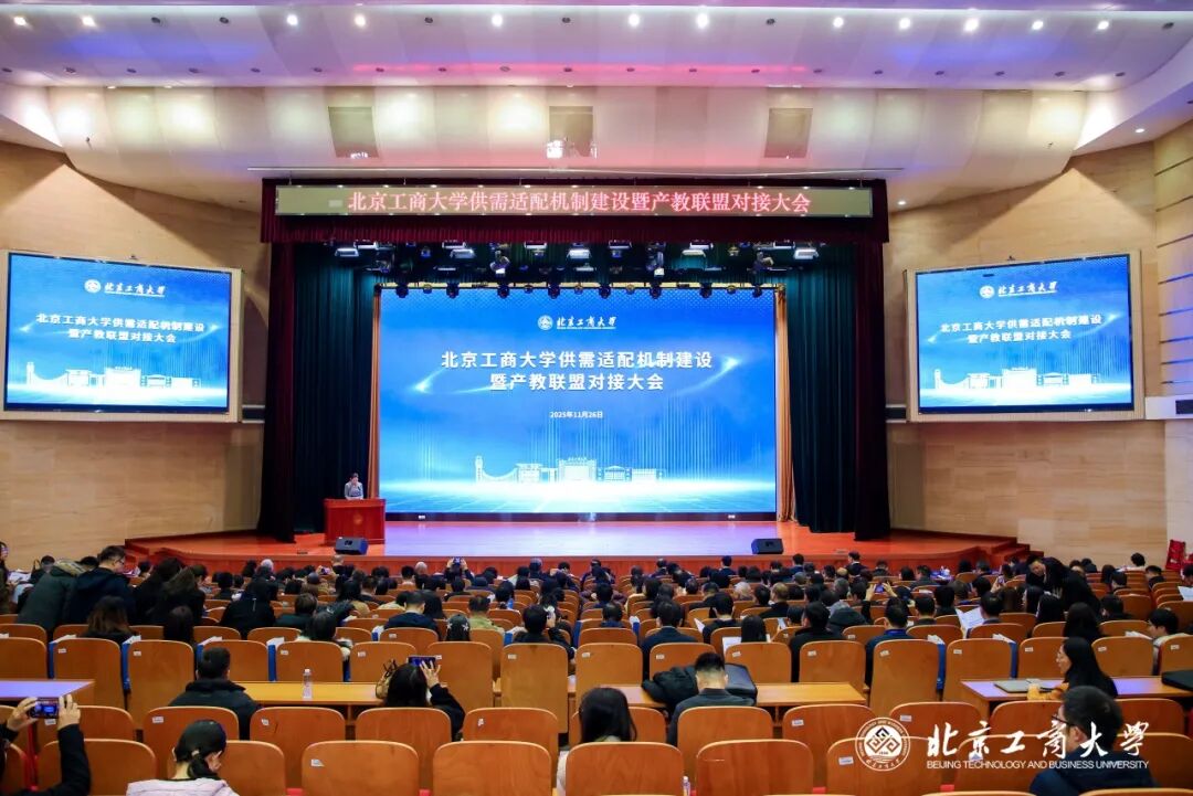 为深入贯彻党的二十届四中全会和全国教育大会精神,全面落实《教育强国建设规划纲要(2024-2035年)》、三年行动计划及北京市实施方案,国家发改委等部门《关于健全高等教育人才培养与经济社会发展需要适配机制的指导意见》,构建“教育链、人才链、产业链、创新链”深度融合的生态体系,11月26日,北京工商大学供需适配机制建设暨产教联盟对接大会在良乡主校区隆重举行。来自政府部门、行业协会、企事业单位的领导嘉宾与学校师生齐聚一堂,以“聚焦供需适配,深化产教融合”为主题,共商人才培养与产业发展协同大计。