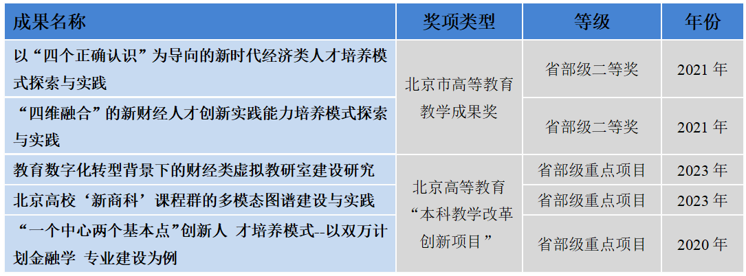 近年来,获北京市教育教学成果奖2项,获批教育部首批新文科研究与改革实践项目1项。北京高等教育“本科教学改革创新项目”立项重点项目3项,北京市教育科学“十四五”规划重点课题2项、优先关注课题1项,一般和青年专项课题7项。