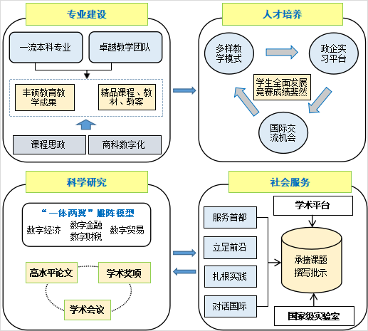 经济学院紧密围绕国家和首都经济社会发展需求,以重点学科建设为导向,推动学科交叉融合,强化应用研究与基础研究的结合,致力于为行业和区域发展提供服务。学院依托“一体两翼”学科群建设方案,以数字金融为“头雁”,以数字经济和数字贸易为“两翼”,“雁阵式”推进应用经济学学科群建设,并整合学院优势资源,打造相应学科团队。在全院师生的长期共同努力下,学院的标志性科研成果、高级别科研项目、横纵向科研经费持续增长。
