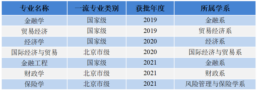 经济学院拥有国家级一流本科专业建设点4个,北京市级一流本科专业建设点3个,战略新兴专业2个。2018年应用经济学获批一级学科博士学位授权点,2019年获批应用经济学博士后科研流动站,应用经济学入选北京高校高精尖学科建设项目,实现高等教育人才培养全层次覆盖。