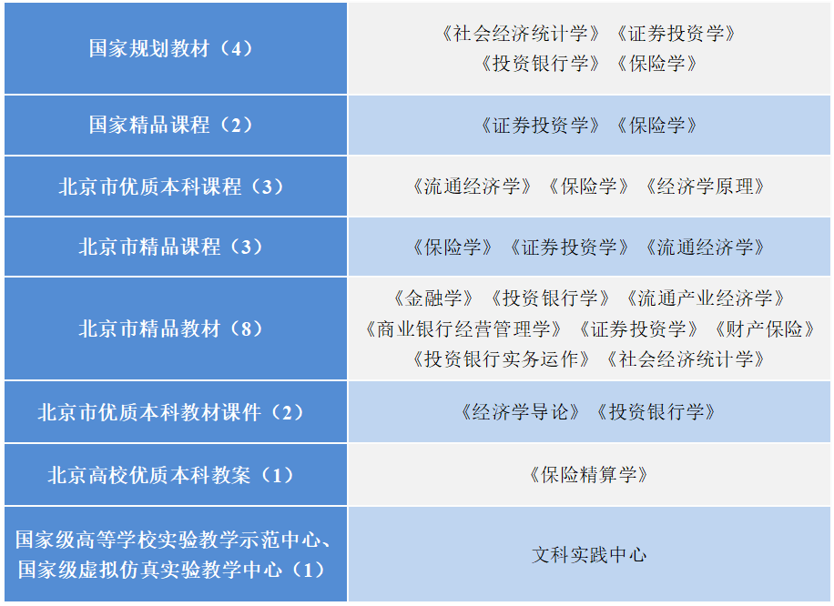学院不断加强专业、课程、教材、教学团队与名师的建设。获批国家精品课程2门,北京市优质本科课程3门,精品课程3门,4部教材入选教育部“十二五”国家规划教材。《保险学》《证券投资学》《金融学》等8部教材被评为北京市精品教材。1名教师荣获“北京市高等学校教学名师奖”,经济管理实验教学团队获批国家级优秀教学团队,金融学教学团队获批北京市优秀教学团队。