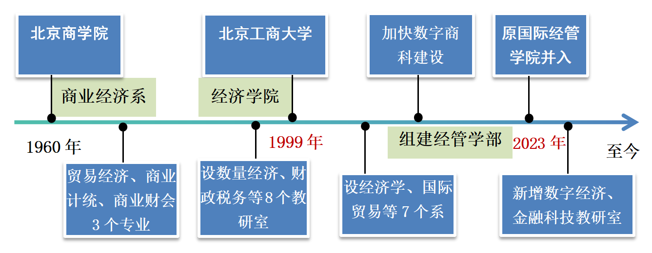 北京工商大学经济学院起源于原北京商学院商业经济系。1960年开始招收本科生,1981年成为全国首批硕士学位授权单位,1997年被确定为原国内贸易部重点学科单位。1999年6月,北京工商大学经济学院成立。2023年,原国际经管学院的数字经济系、金融科技系并入经济学院。