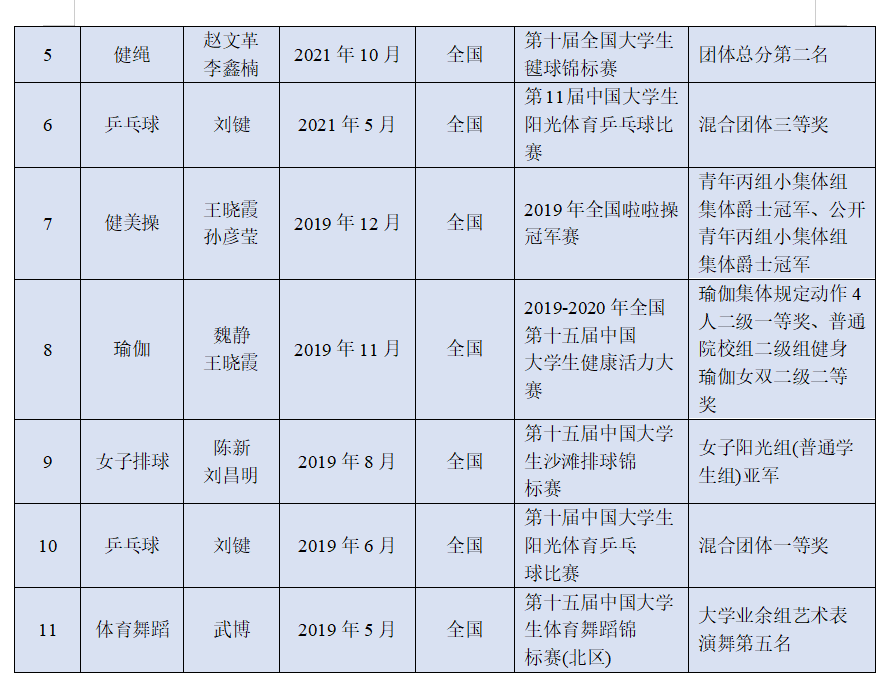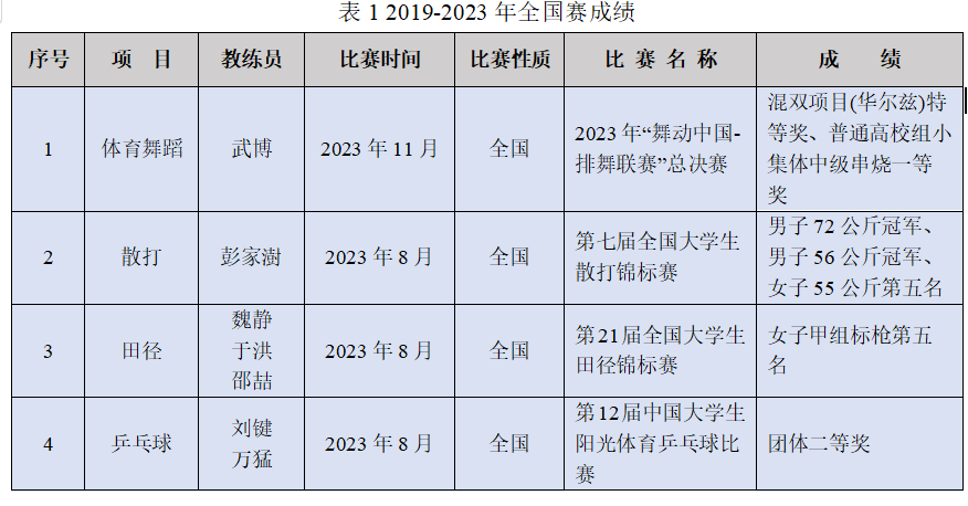在近五年中,学校体育运动队在市级以上比赛中取得显著成绩,有122人次取得体育类全国比赛前八名成绩,2215人次取得省部级前八名成绩。其中,荣获第一名881人次、第二名406人次、第三名344人次。田径队、游泳队、男子排球队、女子排球队参加全国普通学生组比赛,均获得了好成绩。乒乓球队在2019年获得第十届中国大学生阳光体育乒乓球比赛混合团体第一的优异成绩,毽球队在2021年举行的第十届全国大学生毽球锦标赛中获得团体总分第二名的优异成绩,散打队在2023年第7届中国大学生武术散打锦标赛中取得两金的突破性成绩。这些成绩不仅展示了我校体育竞技的实力,也反映了校园文化的活力和学生全面发展的成果。