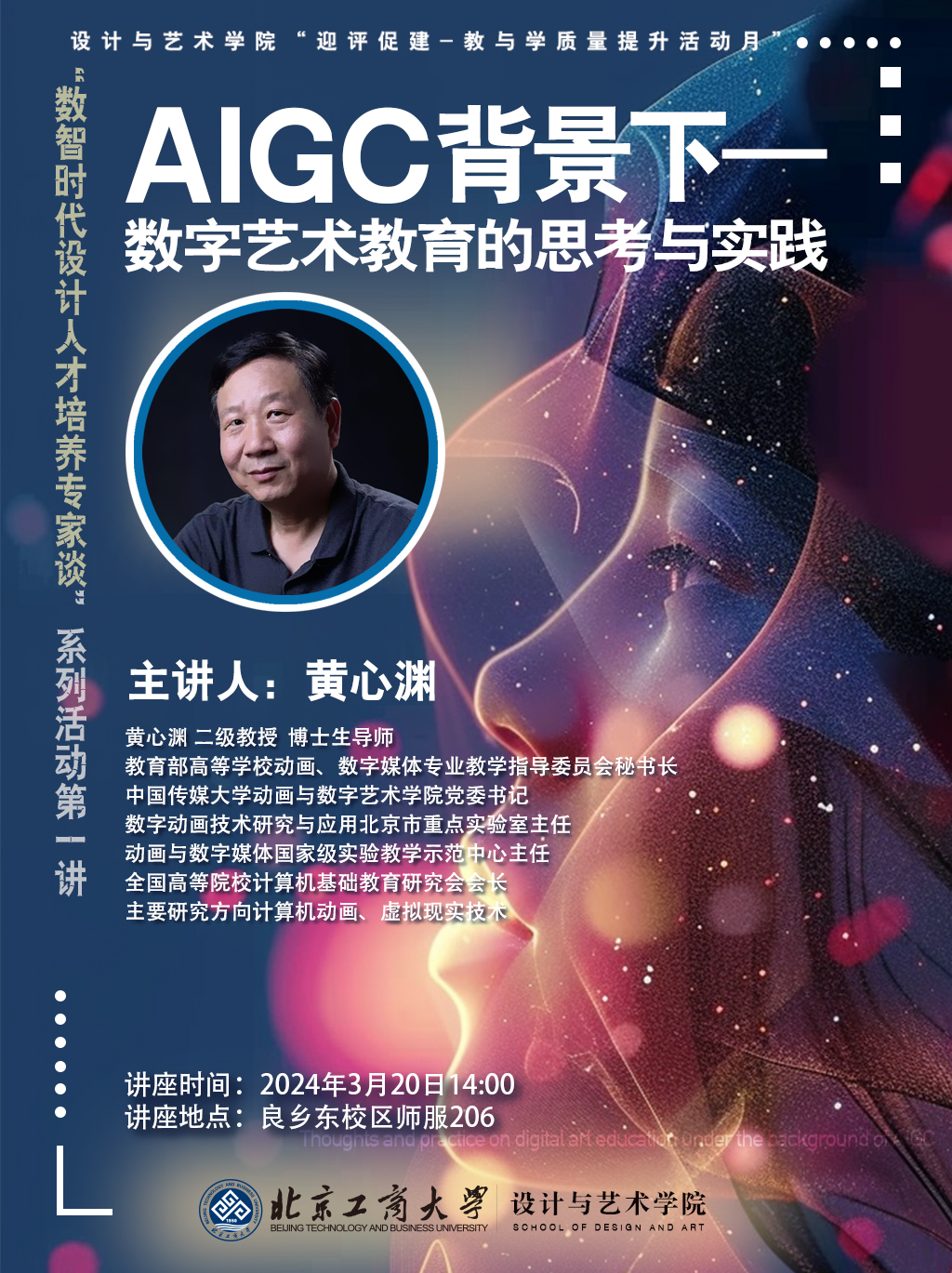 3月20下午,设计与艺术学院举办了“迎评促建—教与学质量提升活动月”之“数智时代设计人才培养专家谈”系列活动第一讲,邀请教育部动画与数字媒体专业教指委秘书长、中国传媒大学动画与数字艺术学院党委书记、数字动画技术研究与应用北京市重点实验室主任、动画与数字媒体国家级实验教学示范中心主任、全国高等院校计算机基础教育研究会会长黄心渊教授莅临指导。学院党委书记王海伟、副院长刘红菊以及专业师生代表参加了本次讲座。