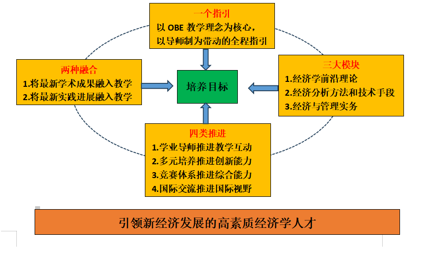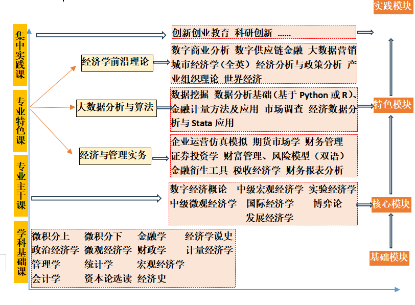遵照国家质量标准,在价值观培养、理论基础、方法和工具、综合问题能力等方面,构建了系统化、模块化、现代化的课程体系。开设经济学前沿理论、大数据分析与算法、经济与管理实务等课程模块,加大实习实训和实验教学在人才培养方案中的比重,全力打造经济学实验班。