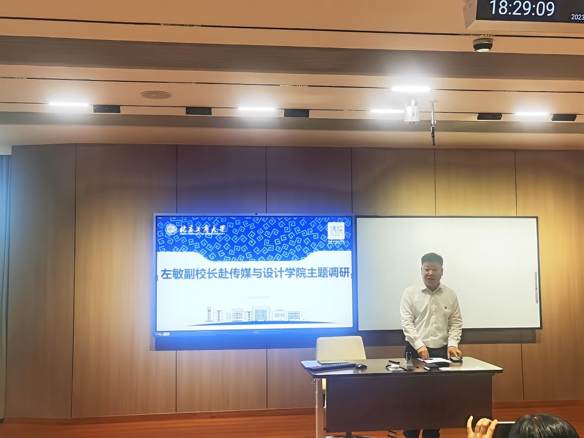 左敏从学校和学院两个层面出发探讨了未来的发展、布局方向,他指出学校接下来的发展将围绕优势学科争取突破“双一流”,商科数字化转型既是学校的重点工作,也应是传媒与设计学院接下来的发展重心。在推进商科数字化转型阶段,传媒与设计学院各专业应抓住教育数字化转型的机会,推进优质课程数字化建设,充分利用专业优势形成集体合力打造数字化金课。左敏对传媒与设计学院的美育教育也寄予厚望,并提出具体要求。